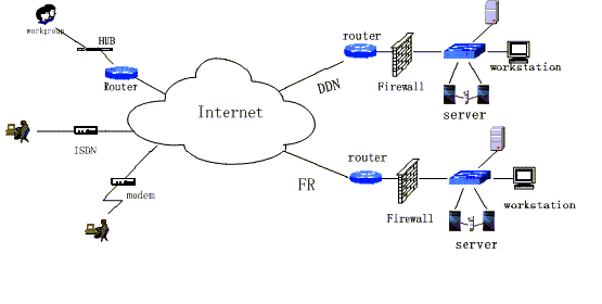 现在企业与Internet连接的线路也有多种选择,有比较成熟的PSTN(公共电话交换网)、分组交换网、DDN(数字数据网),还有新近发展的ISDN(综合业务数字网)、ADSL(非对称数字用户线)、F.R(帧中继)。综合企业的实际需求、费用情况和扩展性等要求,DDN是比较好的选择。一方面DDN技术比较成熟,属于专线连接方式,省却了连网需要拨号的繁琐,可提供全天二十四小时连接;另一方面DDN提供从64K到2M多种带宽供用户选择,用户可根据企业的实际情况自由选择并方便扩展。