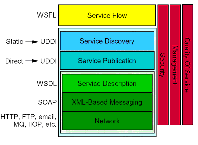 Service的整体架构。和网络的分层结构相同,上一层需要下一层的支持。而安全性、可管理性、服务质量则需要在各个层次都有所体现。Web